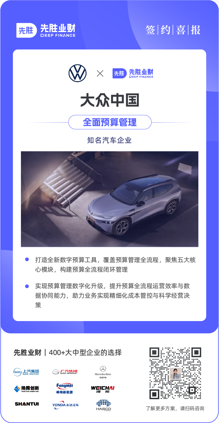 知名汽车企业大众中国携手先胜业财打造全新数字预算管理系统,覆盖预算管理全流程,聚焦五大核心模块,五大核心模块,实现预算全流程闭环管理。实现预算管理数字化升级,提升预算全流程运营效率与数据协同能力,助力业务实现精细化成本管控与科学经营决策。