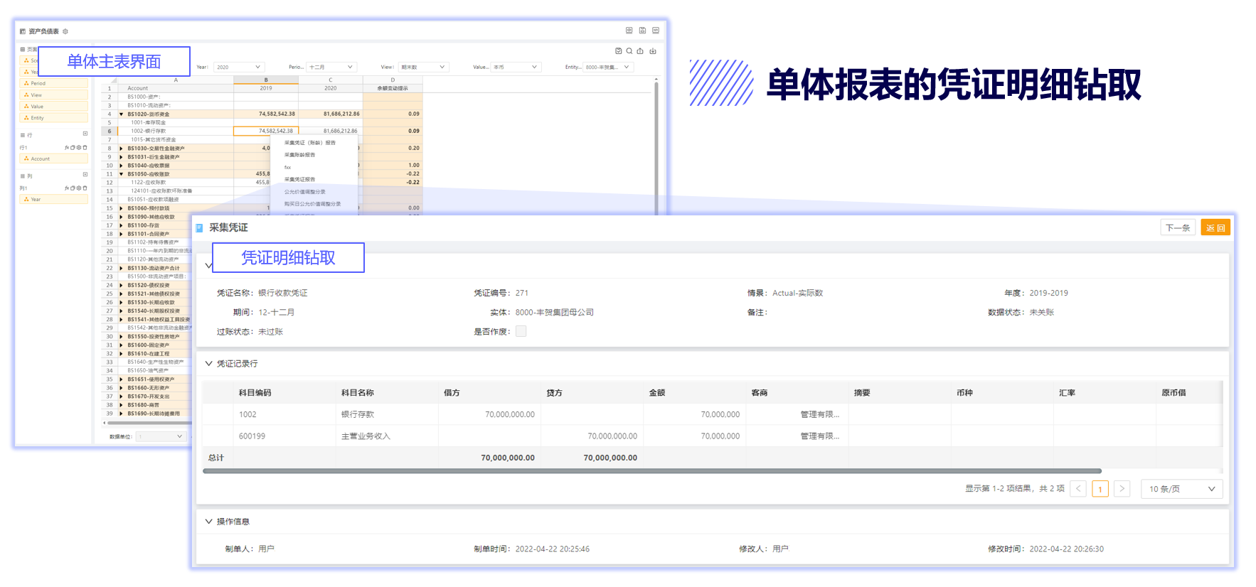 原生支持浮动行报表,可实现全套附注的自动计算生成、手工采集和抵销,配套台账管理功能支撑附注自动出具;支持报表结果到业务单据的全链路钻取,完美适配审计与监管要求